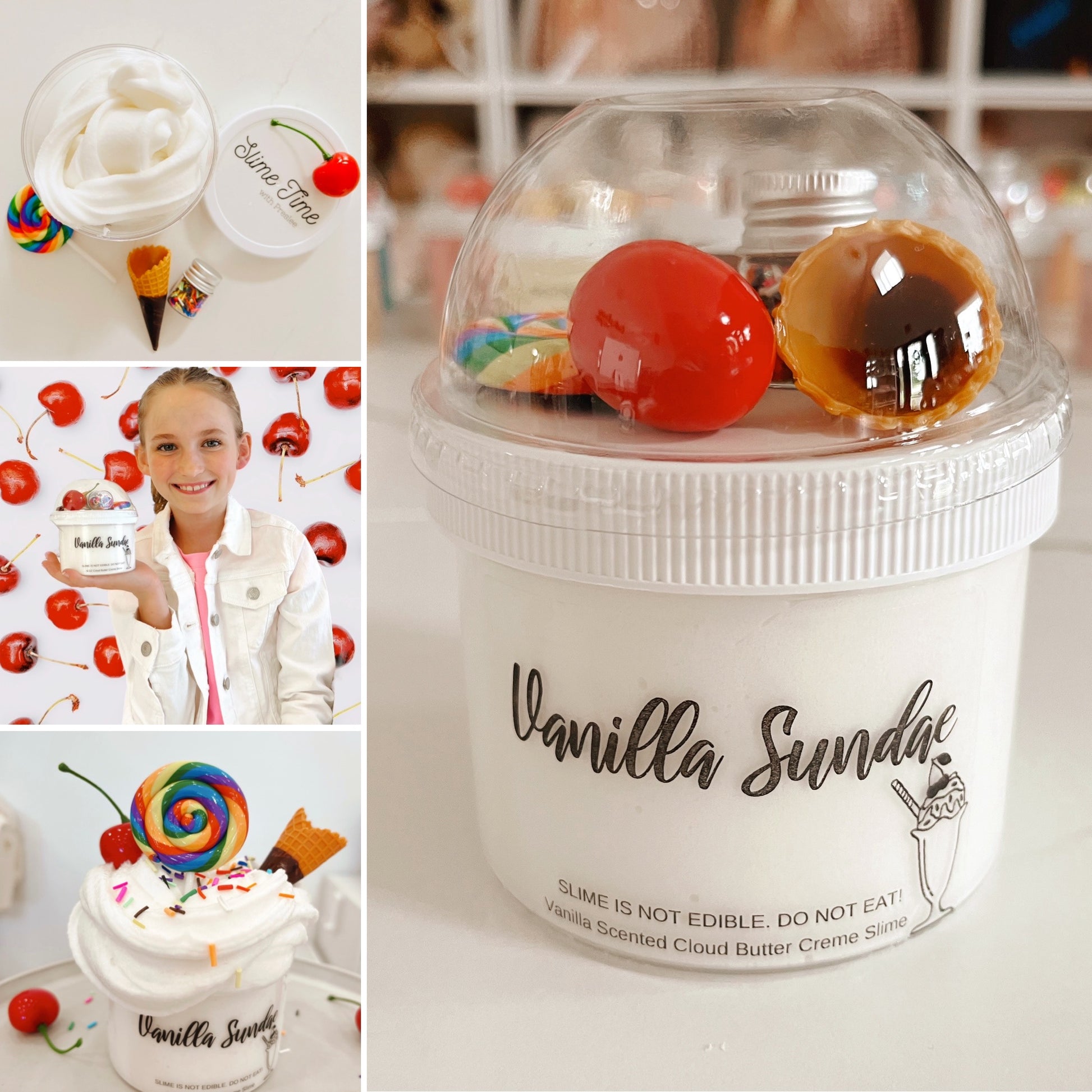 Slime Time with Preslee Vanilla Sundae slime is so soft, thick, stretchy and smells so good! Slime is handmade in small batches in our shop in Ohio! Always fresh and made to order.