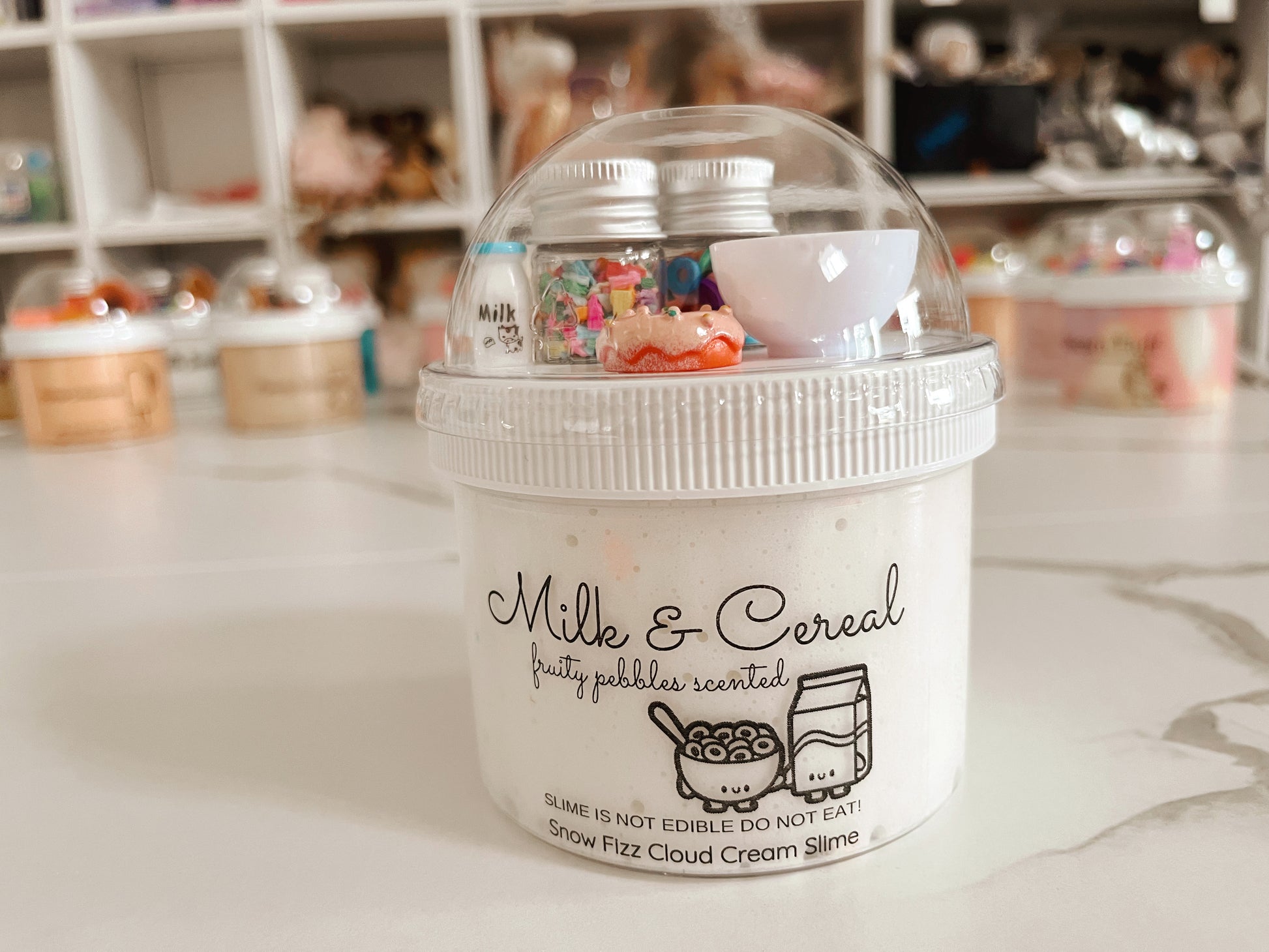 Milk and Cereal slime is so stretchy and smells just like fruity pebbles! Slime is handmade in small batches in our shop in Ohio! Always fresh and made to order. Great texture for kids!!