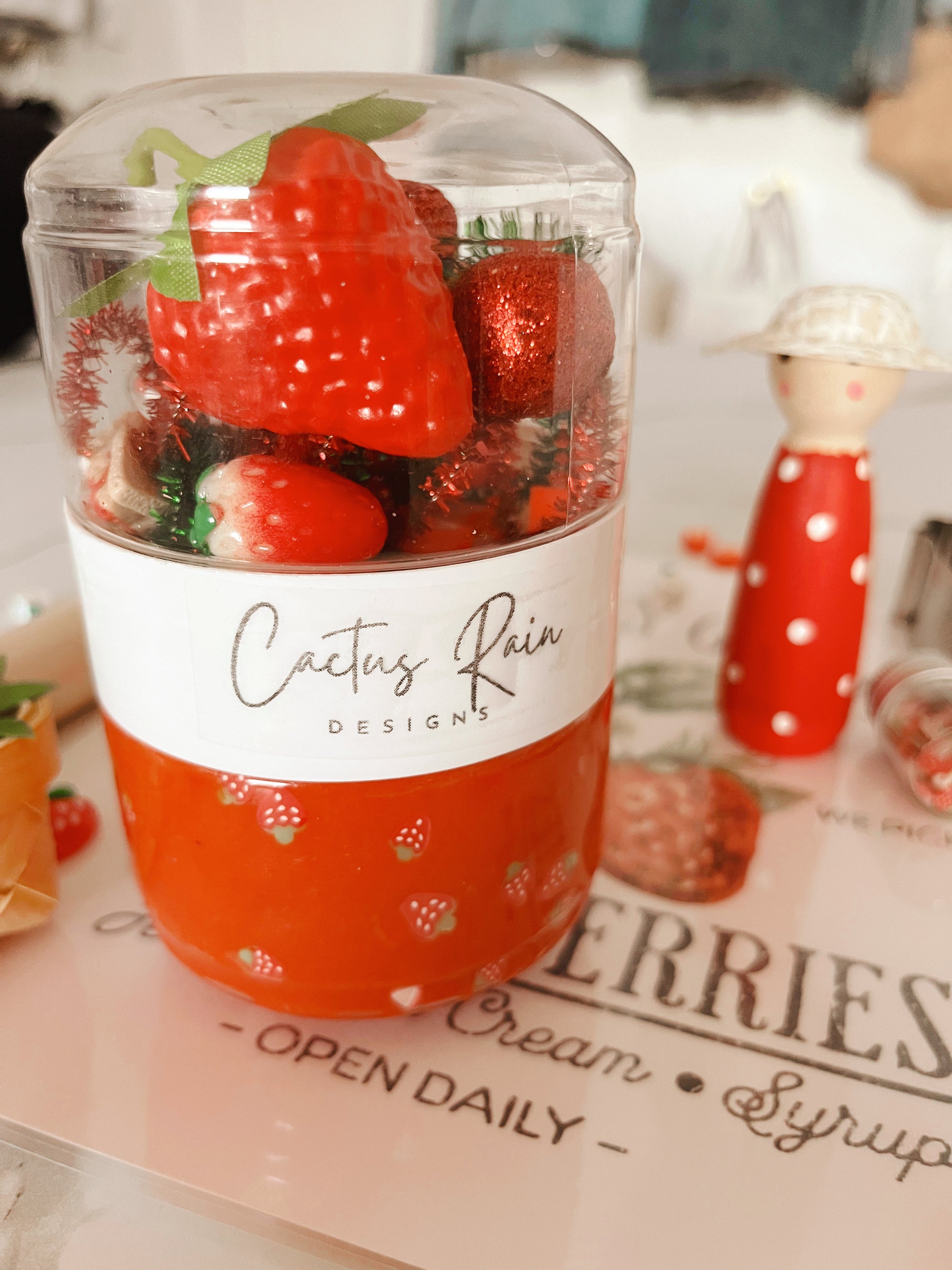 Create your very own strawberry patch with our Sensory Dough Play Kits. Each kit contains a 2-layer jar filled with strawberry themed goodies, a rolling pin, laminated mat, strawberry dough cutter, faux strawberries, wooden peg doll, clay sprinkles,bag of beans to resemble strawberry seeds, mini basket and shovel. Our dough is carefully prepared using all-natural, non-toxic ingredients in our shop.